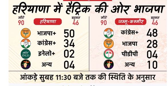 हरियाणा में ताजा रुझानों के अनुसार, भाजपा जीत की हैट्रिक लगाने के लिए तैयार है। साढ़े 11 बजे तक के आंकड़ों के अनुसार, भाजपा 50 सीटों पर आगे चल रही है। वहीं कांग्रेस 34 सीटों पर और इनेलो प्लस 2 सीटों पर आगे है।