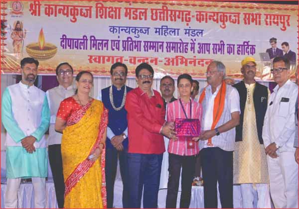 कान्यकुब्ज ब्राह्मण समाज द्वारा विगत दिनों आर्शिवाद भवन में आयोजित प्रतिभा सम्मान समारोह में स्क्वैश के राष्ट्रीय खिलाड़ी सूर्यांश मिश्रा को राष्ट्रीय स्कूल गेम्स 2023 -24 जो पुणे महाराष्ट्र में आयोजित हुई थी छत्तीसगढ़ की अंडर -14 टीम में चयन होने पर सम्मानित किया गया। सांसद श्री बृजमोहन अग्रवाल द्वारा सिल्वर मैडल और उपहार देकर यह सम्मान उन्हे प्रदान किया गया। प्रतिभावान खिलाड़ी सूर्यांश अनुराग मोमेंटो हाउस के संचालक अनुराग मिश्रा के पुत्र हैं।