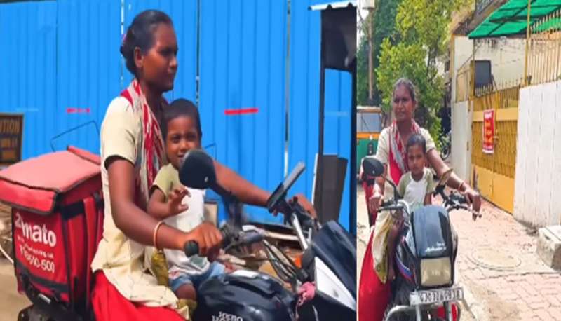इंस्टाग्राम पर सामने आए एक वीडियो में राजकोट, गुजरात की एक महिला फूड डिलीवरी पार्टनर दिखाई दे रही है। क्लिप में, वह बाइक चलाती हुई दिखाई दे रही है, जिसके पीछे जोमैटो डिलीवरी बॉक्स लगा हुआ है, जबकि उसका बच्चा उसके सामने बैठा है।