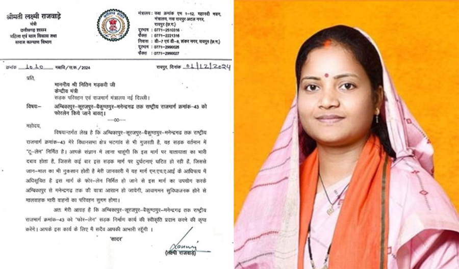 महिला एवं बाल विकास व समाज कल्याण मंत्री एवं भटगांव विधायक लक्ष्मी राजवाड़े ने केंद्रीय सड़क परिवहन एवं राजमार्ग मंत्री श्री नितिन गडकरी को पत्र लिखकर अंबिकापुर-सूरजपुर-बैकुंठपुर-मनेन्द्रगढ़ राष्ट्रीय राजमार्ग (एनएच-43) को दो लेन से फोर लेन में विस्तारित करने और इस मार्ग पर अंबिकापुर (जिला सरगुजा) के गांधी चौक से लेकर सूरजपुर जिले के पार्वतीपुरम गांव स्थित कुम्दा मोड़ तक बने बड़े-बड़े गड्ढों की जल्द मरम्मत कराने का आग्रह किया।