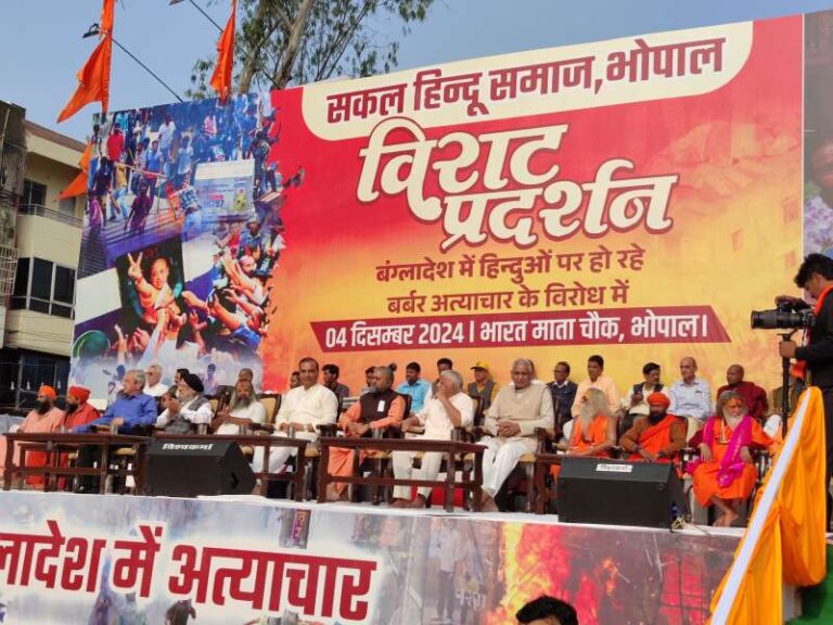 बांग्लादेश में हिन्दुओं पर हो रहे अत्याचार के खिलाफ बुधवार को भारत माता चौक, भोपाल में विराट प्रदर्शन किया गया। बांग्लादेश में हिन्दुओं पर हो रहे अत्याचार के खिलाफ सकल हिन्दू समाज भोपाल द्वारा विराट प्रदर्शन का आयोजन किया गया जिसमें बड़ी में हिन्दू समाज के लोग एवं संत उपस्थित रहे। दोपहर 2 बजे से शुरू हुए इस विशाल प्रदर्शन में हजारों की संख्या में लोग उपस्थित रहे। प्रदर्शन के साथ ही आज भोपाल के व्यापारियों ने स्वेच्छा से बाजार आधे दिन के लिए बंद रखे, कृषि उपज मंडी से अनाज की खरीदारी भी पूरी तरह बंद रही।