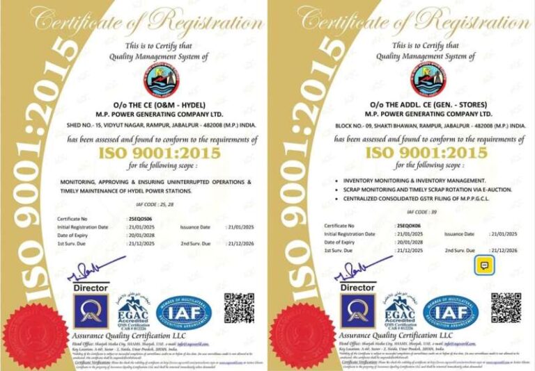 भोपाल : मध्यप्रदेश पॉवर जनरेटिंग कंपनी के मुख्यालय जबलपुर के दो कार्यालयों मुख्य अभियंता उत्पादन भंडार और मुख्य अभियंता संचालन संधारण-जल विद्युत को उत्कृष्ट मानदंडों का पालन करने के लिए अंतर्राष्ट्रीय क्वालिटी मैनेजमेंट सिस्टम 9001:2015 सर्टिफिकेशन प्राप्त हुआ है। मध्यप्रदेश पॉवर जनरेटिंग कंपनी के दो कार्यालयों को आईएसओ सर्टिफिकेशन होने पर ऊर्जा मंत्री प्रद्युम्न सिंह तोमर ने कार्यालयों के समस्त अभियंताओं और कार्मिकों को शुभकामना और बधाई दी। उन्होंने अपेक्षा व्यक्त की कि ये कार्यालय भविष्य में भी इसी प्रकार उच्च स्तरीय क्वालिटी मानदंडों का पालन करते हुए कार्य करेंगे।