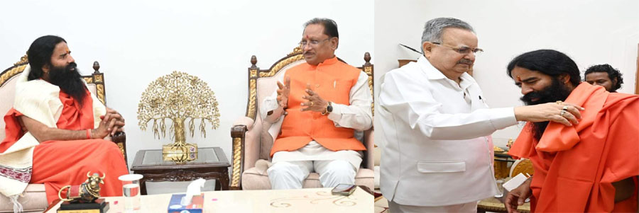 मुख्यमंत्री विष्णुदेव साय से योग गुरु बाबा रामदेव ने आज मुख्यमंत्री निवास में सौजन्य मुलाकात की. इस दौरान मुख्यमंत्री की धर्मपत्नी कौशल्या साय एवं परिजन उपस्थित थे. वहीं स्पीकर हाउस रायपुर पहुंचकर बाबा ने विधानसभा अध्यक्ष डॉ. रमन सिंह से भी शिष्टाचार भेंट की. इस अवसर पर डॉ. रमन सिंह ने योग के महत्व, शारीरिक एवं मानसिक स्वास्थ्य को लेकर सार्थक संवाद किया. बातचीत के दौरान दोनों ने योग को जन-जन तक पहुंचाने और समाज में स्वास्थ्य जागरूकता बढ़ाने के प्रयासों पर विस्तार से चर्चा की.