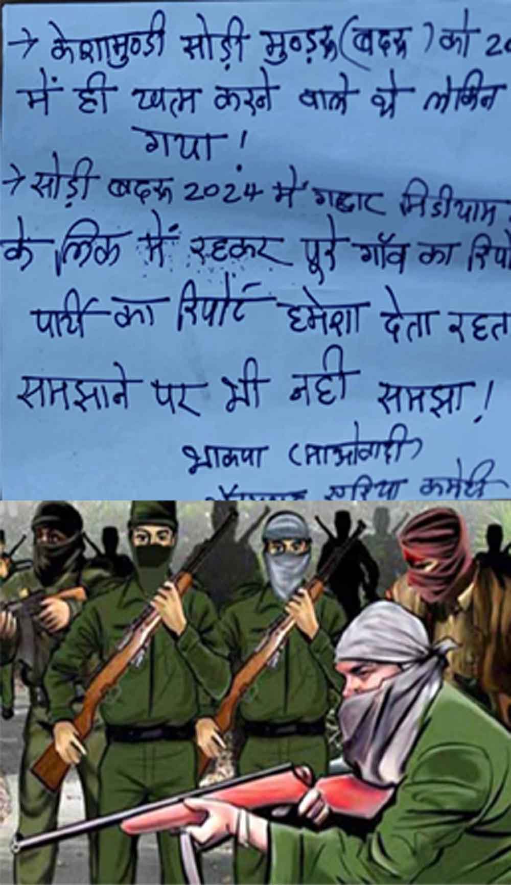 घटना स्थल से भैरमगढ़ एरिया कमेटी का पर्चा बरामद हुआ है। जिसमें नक्सलियों ने गद्दार का साथ देने, सलवा जुडूम में काम करने और पार्टी की सूचना देने की बात लिखी गई है। पुलिस शव को कब्जे में लेकर जांच में जुट गई है। नक्सलियों ने बीती रात जिले के भैरमगढ़ थाना क्षेत्र के ग्राम केशामुंडी निवासी ग्रामीण भदरू सोढ़ी पिता हिड़मा उम्र 41 की बीती रात नक्सलियों ने घर में घुस कर कुल्हाड़ी से हमला कर हत्या कर दी।