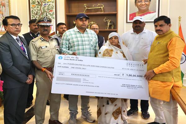 भोपाल: मुख्यमंत्री डॉ. मोहन यादव ने मुख्यमंत्री निवास पर मऊगंज जिले के गौतम परिवार को व्यक्तिगत दुर्घटना बीमा के अंतर्गत एक करोड़ रूपये की राशि का चेक प्रदान किया। भारतीय स्टेट बैंक की पुलिस सेलरी पैकेज योजना में पुलिसकर्मियों को दी जाने वाली पूरक व्यक्तिगत दुर्घटना बीमा सुविधा के अनुसार परिवार को यह राशि प्रदान की गई। मुख्यमंत्री डॉ. यादव ने शहीद गौतम के पात्र उत्तराधिकारी को शासकीय सेवा में लेने के निर्देश पुलिस महानिदेशक को दिए हैं।