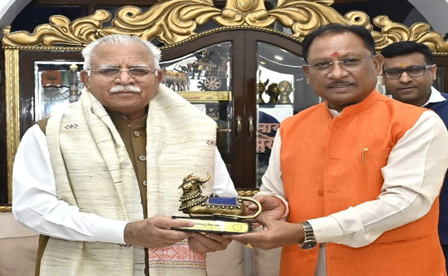 रायपुर। मुख्यमंत्री श्री विष्णु देव साय से आज मुख्यमंत्री निवास में केन्द्रीय आवास और शहरी विकास मंत्री श्री मनोहर लाल खट्टर ने सौजन्य मुलाकात की। मुख्यमंत्री ने श्री खट्टर का शॉल एवं प्रतीक चिन्ह नंदी भेंटकर अभिनंदन किया। इस अवसर पर विधानसभा अध्यक्ष डॉ. रमन सिंह, वन मंत्री श्री केदार कश्यप, विधायक श्री किरण सिंह देव उपस्थित थे।