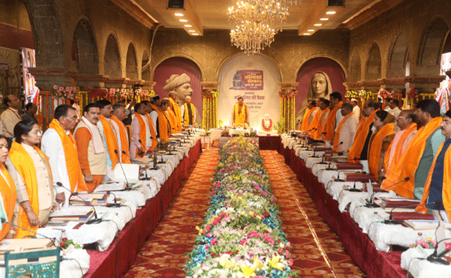 डॉ. मोहन यादव कैबिनेट की बैठक आज इंदौर के राजवाड़ा के गणेश हॉल में हुई। हॉल में देवी अहिल्या की मूर्ति को सीएम से आगे रखा गया। मूर्ति के दांयीं तरफ सीएम बैठे थे। बैठक से पहले देवी अहिल्या का स्मरण कर पुष्पांजलि दी गई। सीएम और कुछ मंत्री धोती-कुर्ता पहने भगवा दुपट्टा डालकर बैठक में पहुंचे थे।