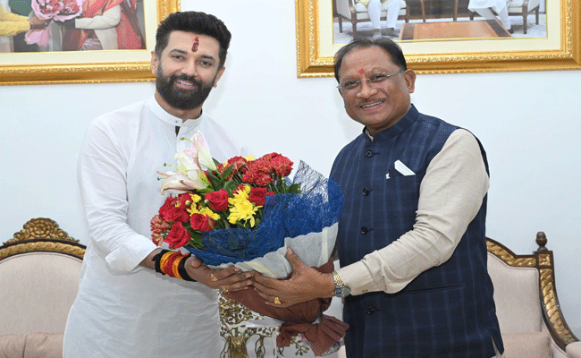 रायपुर। मुख्यमंत्री श्री विष्णु देव साय से आज मुख्यमंत्री निवास कार्यालय में केन्द्रीय खाद्य प्रसंस्करण उद्योग मंत्री श्री चिराग पासवान ने सौजन्य मुलाकात की। इस दौरान श्री साय ने श्री पासवान को कोसा वस्त्र एवं बेल मेटल से बने स्मृति चिन्ह भेंटकर आत्मीय स्वागत किया। गौरतलब है कि केन्द्रीय खाद्य प्रसंस्करण उद्योग मंत्री श्री चिराग पासवान आज एक दिवसीय प्रवास पर छत्तीसगढ़ पहुंचे थे।