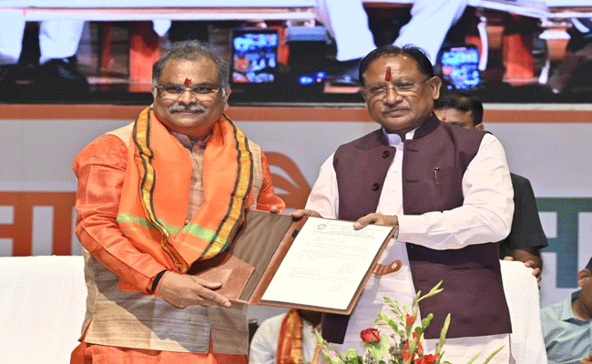 रायपुर। मुख्यमंत्री श्री विष्णु देव साय आज राजधानी रायपुर स्थित पंडित दीनदयाल उपाध्याय ऑडिटोरियम में छत्तीसगढ़ स्टेट बेवरेजेस कॉर्पोरेशन के नव नियुक्त अध्यक्ष श्रीनिवास मद्दी के पदभार ग्रहण एवं अभिनंदन समारोह में मुख्य अतिथि के रूप में शामिल हुए। इस अवसर पर उन्होंने श्री मद्दी को नई जिम्मेदारी के लिए हार्दिक शुभकामनाएं दीं।