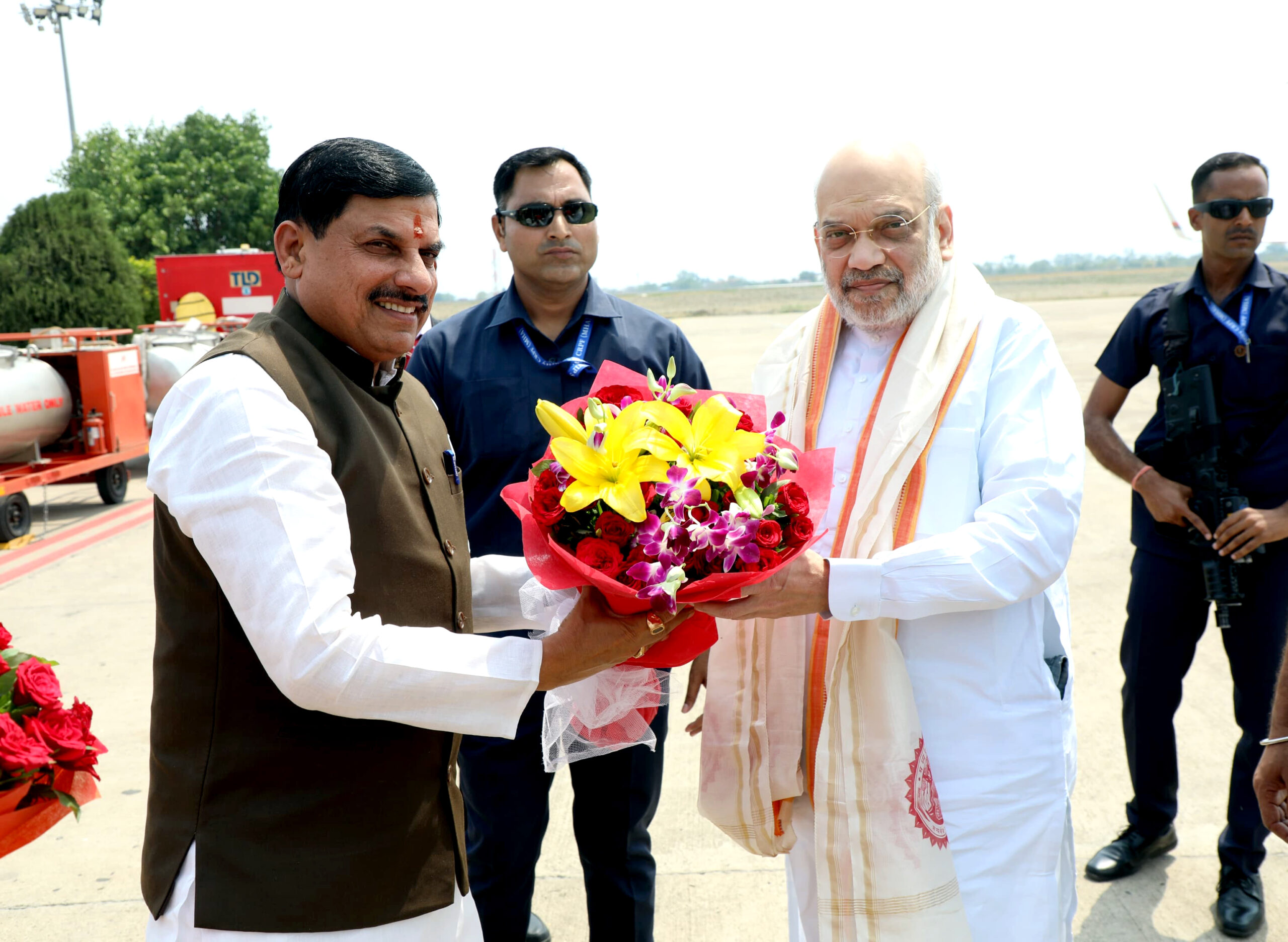 भोपाल : केंद्रीय गृह एवं सहकारिता मंत्री श्री अमित शाह का मुख्यमंत्री डॉ. मोहन यादव ने एयरपोर्ट के ओल्ड टर्मिनल पर पुष्पगुच्छ भेंटकर आत्मीय स्वागत किया। गृह मंत्री श्री शाह के साथ मुख्यमंत्री डॉ. यादव और केंद्रीय कृषि मंत्री श्री शिवराज सिंह चौहान भी हेलीकॉप्टर से पचमढ़ी के लिए रवाना हुए।