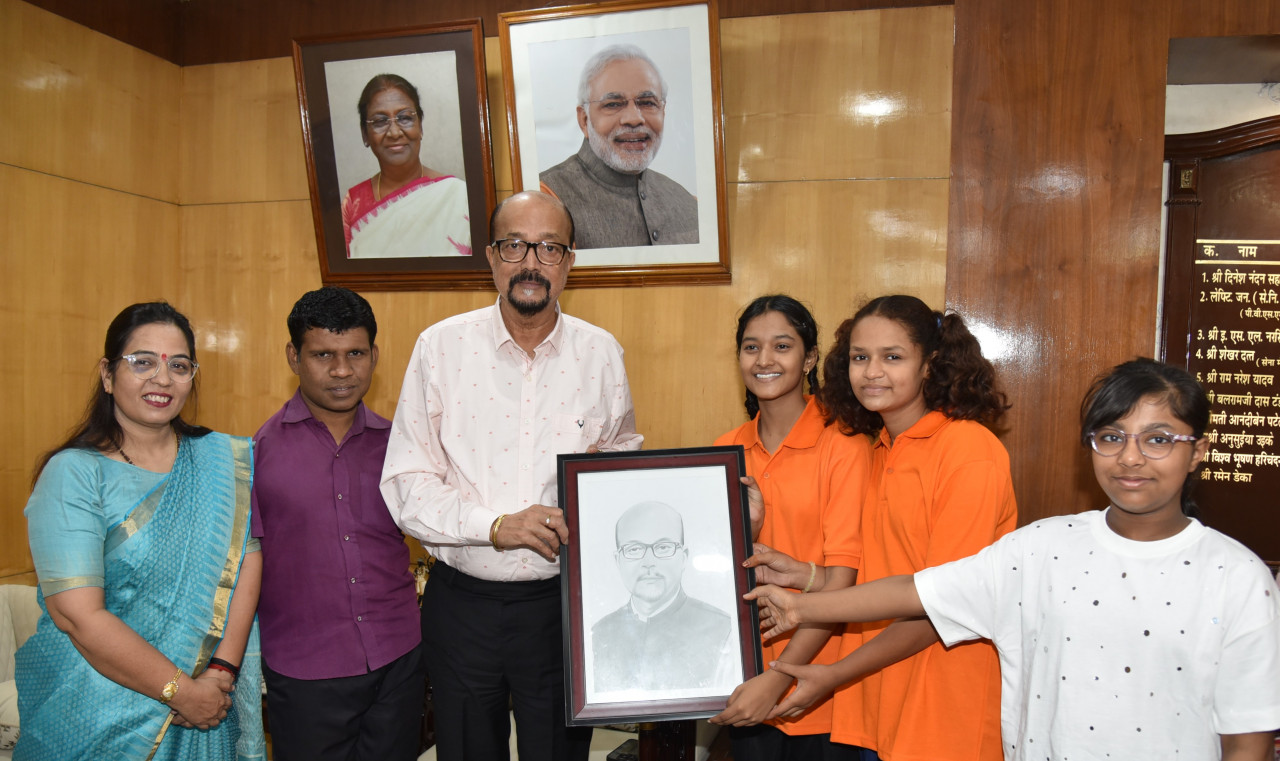 रायपुर: राज्यपाल श्री रमेन डेका से आज राजभवन में कोपलवाणी विशेष स्कूल रायपुर के बच्चों ने मुलाकात की। मूक-बधिर बालक श्री गौकरण पाटिल ने श्री डेका को उनकी पोट्रेट भेंट की। गौकरण के हाथ नहीं है साथ ही वह सुनने और बोलने में भी असमर्थ है। राज्यपाल का पोट्रेट उसने अपने पैरों से बनाया है। श्री डेका ने चित्रकला में निपुण बच्चोें का उत्साहवर्धन किया।