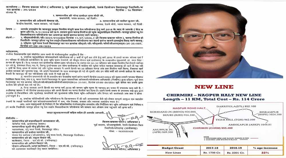 रेलवे डिवीजन बिलासपुर के पूर्व डीआरयूसीसी सदस्य अधिवक्ता विजय प्रकाश पटेल ने प्रधानमंत्री नरेंद्र मोदी, रेलमंत्री अश्विनी वैष्णव तथा रेलवे बोर्ड अध्यक्ष सतीश कुमार को पत्र प्रेषित कर उनके हस्तक्षेप के बावजूद साझा वित्तीय मंजूरी प्राप्त चिरमिरी-नागपुर हॉल्ट न्यू रेल