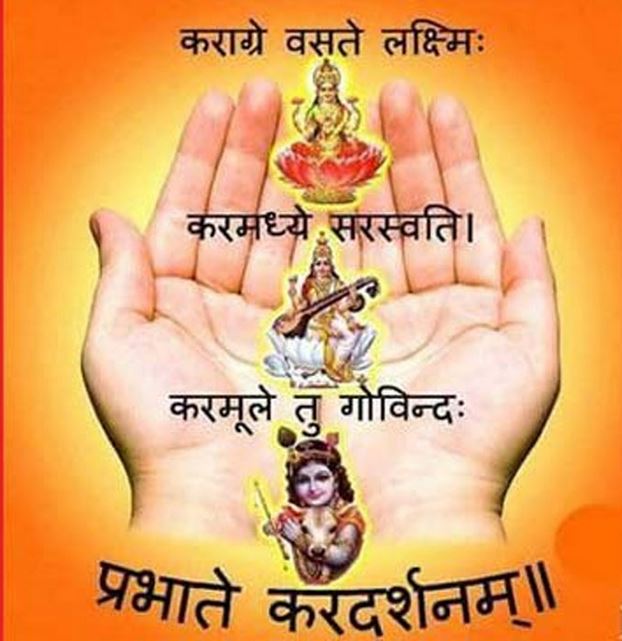 कराग्रे वसते लक्ष्मी करमध्ये सरस्वती। करमूले तू गोविन्दः प्रभाते करदर्शनम ॥ कहा गया है कि हथेली के अगले हिस्से में देवी लक्ष्मी का वास होता है, मध्य में सरस्वती का और मूल भाग में भगवान विष्णु विराजते हैं। यही कारण है कि सुबह उठकर सबसे पहले दोनों हाथों की हथेली को जोड़कर देखना चाहिए, ऐसा शास्त्रों का मत है। इसे व्यावहारिक रूप में देखें तो हथेली से ही सभी कर्म किए जाते हैं और इसी से धन और धर्म दोनों कर्तव्यों को पूरा किया जाता है इसलिए हथेली देखने की बात की जाती है।